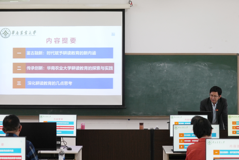 李敏副主任在讲课中带领大家简要回顾了我国农耕文明发展史,重点讲述了以“耕以养生,读以明道”为特征的耕读教育的发展历程、本质内涵和新时代加强耕读教育的重要意义、时代要求。全面回顾了我校开展农耕教育的历史,李敏说,我校百十年发展历程就是耕读教育的壮丽诗篇,经过百年探索和实践,我校农耕教育已经形成规模发展、特色鲜明的耕读教育体系,培养出大量卓越农林人才,获得一大批成果。李敏强调,新时期我们应贯彻党的二十大精神,立足“农、工、管”耕读教育大平台,找准全面推进耕读教育的有效着力点,从构建耕读教育课程教材体系、拓展耕读教育实践空间,政、产、学、研、城、乡协同、完善耕读教育的考评机制等方面进一步加强和完善耕读教育体系,培养新型“三农”的人才,为建设农业强国贡献力量。(文/图 李亚娟 刘小波)