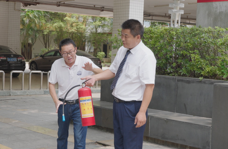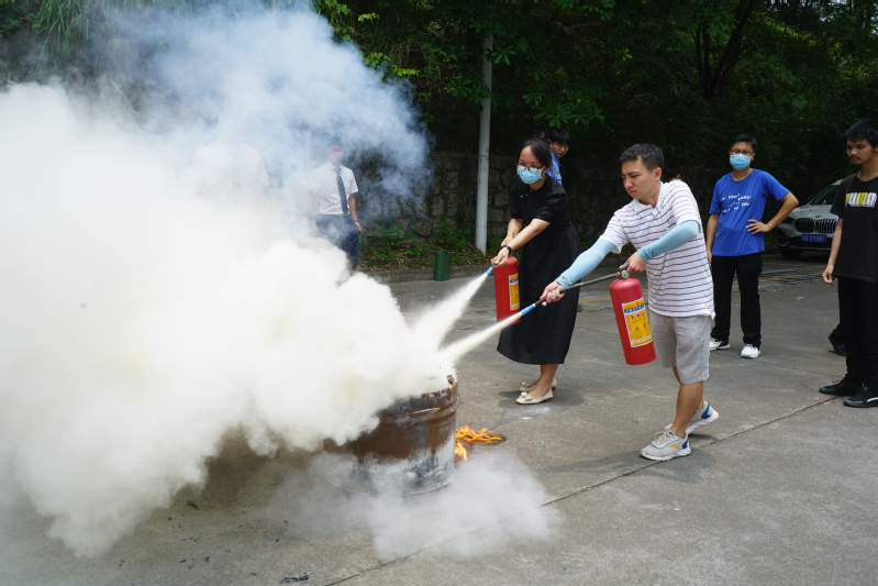 随后,中心副主任、消防演练副总指挥龚正想和广电物业王伟经理给参加演练的师生演示了干粉灭火器的使用方法。首先讲解干粉灭火器的使用操作步骤,牢记“一摇、二对、三拔、四压”使用口诀,正确地使用干粉灭火器。接着介绍了干粉灭火器的使用技巧,使用人员的站位以及自身安全的防护。为使培训内容更加深刻,工作人员点燃演示火焰后,师生们有序分成两组,按步骤现场实操使用干粉灭火器,逐一对燃烧火焰进行扑灭。