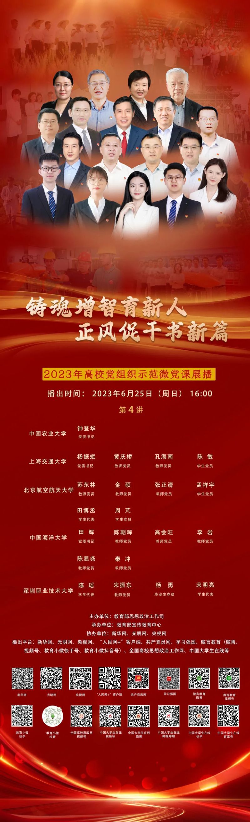 6月25日下午,中心在609课室组织全体教职工集中学习收看2023年高校党组织示范微党课展播第4讲。第4讲微党课分别由中国农业大学《牢记嘱托 砥砺前行,奋力推进解民生治学问育英才》、北京航空航天大学《空天报国担使命 悟深走实促发展》、上海交通大学《胸怀国之大者 践行责任使命》、中国海洋大学《牢记嘱托 谋海济国》、深圳职业技术大学《技能强国 实干兴邦》五所高校主讲。