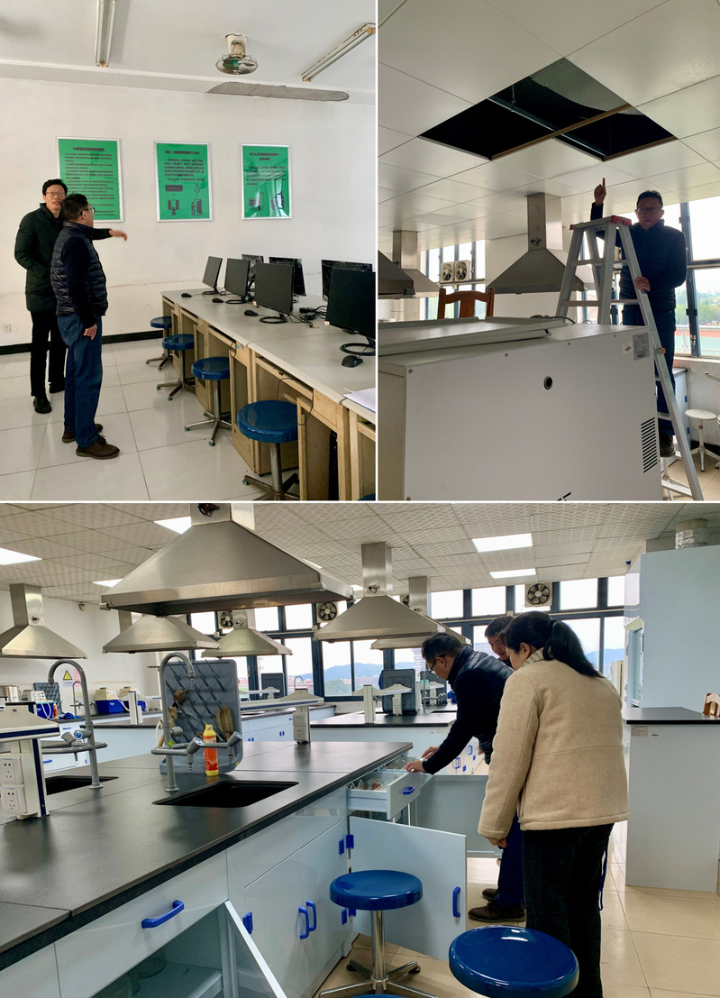 检查组先后检查了化学、生物化学、物理、计算机、植物学、管理训练中心、遗传学等实验室的卫生情况,详细了解各实验室的教学开展情况,对危化品的管理、存放、使用、台账等方面进行详细了解和查阅,并提出改进措施。重点查看了上学期检查过程中发现的地砖爆裂维修情况,化学、生物化学的地砖已完成更换工作,其他实验室也正在有序铺开地砖更换。有实验室疑似排污管臭气泄露,个别实验室天花板掉落严重尚未修复,已叮嘱实验室工作人员再上报,以免影响正常教学。从检查情况来看,各实验室准备工作平稳有序、总体良好。