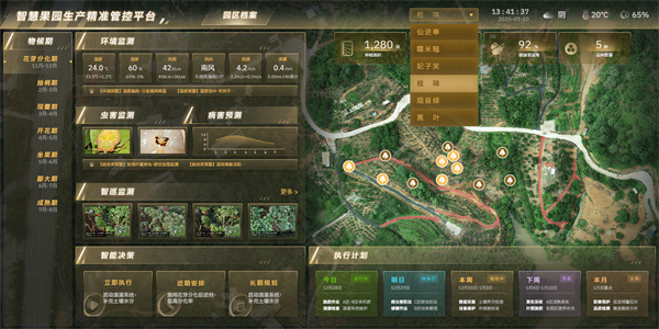 作为“智慧果园”的“数字大脑”,精准管控云平台集成了地块标注、气象与土壤数据实时查看、灌溉策略设置及农事任务管理等多项功能。学生通过Web界面即可轻松完成各项操作,同步获取虫情监测设备的AI识别结果。结合VR全景漫游与多源数据可视化功能,沉浸式体验“环境感知-数据分析-智能决策”的农业数字化全流程,直观了解物联网、AI、大数据等技术在现代农业中发挥的重要作用。